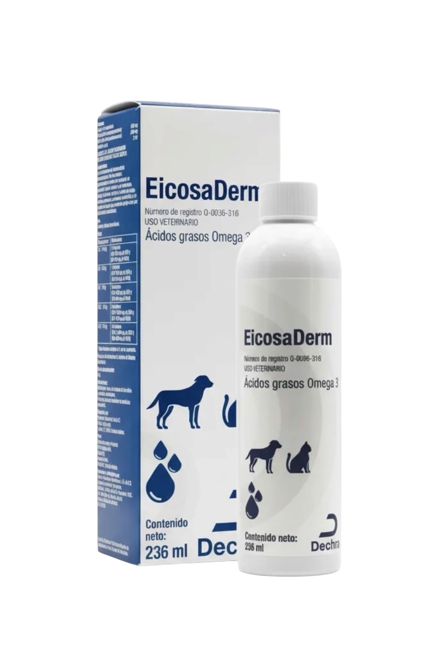 Suplemento veterinario líquido de ácidos grasos Omega 3 (EPA y DHA), indicado para perros y gatos con problemas dermatológicos como dermatitis alérgica, seborrea, alergia a la saliva de pulga o pelaje seco.
